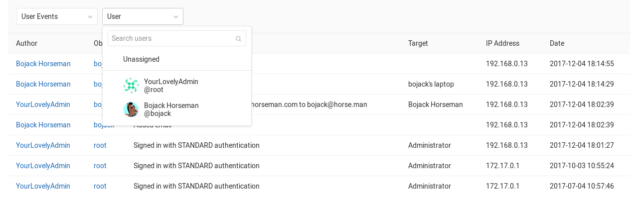 It is possible to filter particular actions by choosing an audit data type from the filter drop-down. You can further filter by specific group, project or user (for authentication events).