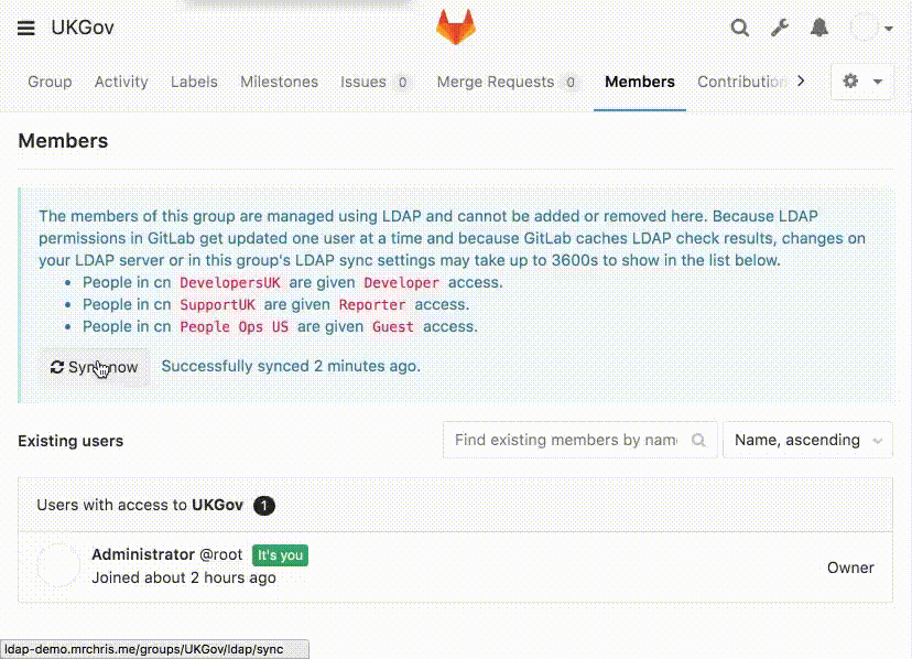 As an example, let's suppose we have a "UKGov" GitLab group, which deals with confidential government information. Therefore, it is important that users of this group are given the correct permissions to projects contained within the group. Granular group permissions can be applied based on the AD group.