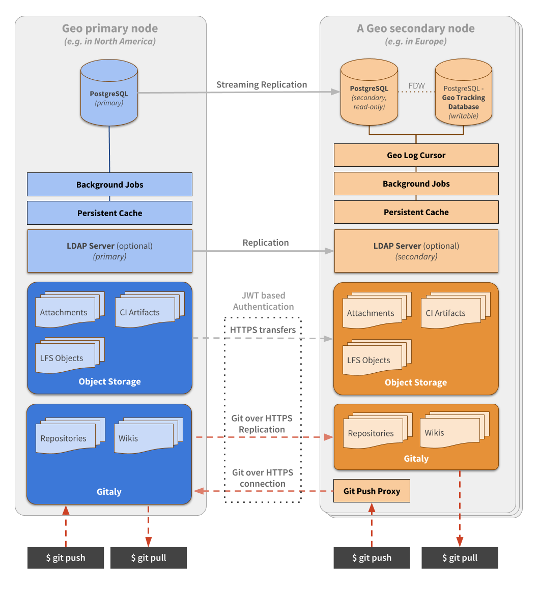 Geo connects GitLab instances together. One GitLab instance is designated as a primary node and can be run with multiple secondary nodes. Geo orchestrates quite a few components that can be seen on the diagram below and are described in more detail within this document.
