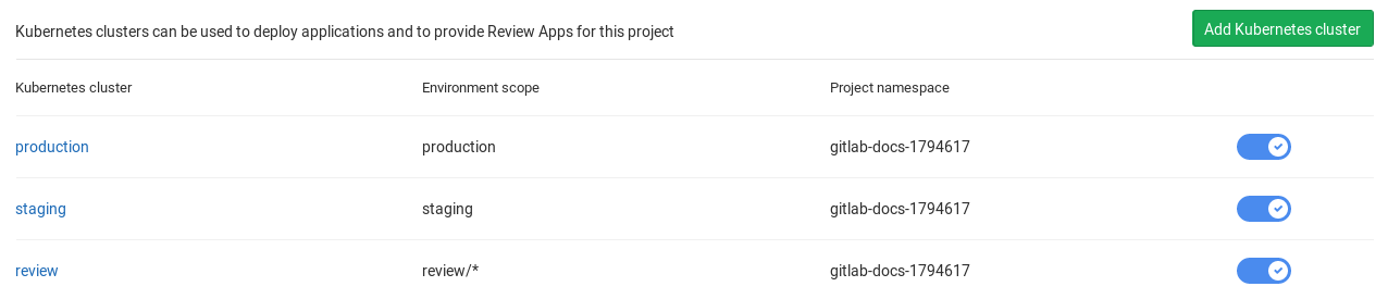 Navigate to your project's Operations > Kubernetes and create the Kubernetes clusters with their respective environment scope as described from the table above.