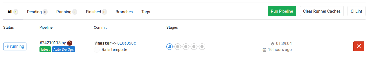 Once you submit the merge request, you'll see the pipeline running. This will