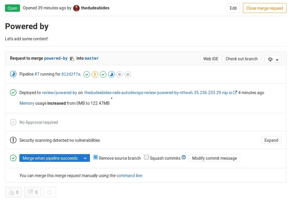 Now, if you go back to the merge request you should not only see the test passing, but also the application deployed as a review app. You can visit it by following the URL in the merge request. The changes that we previously made should be there.