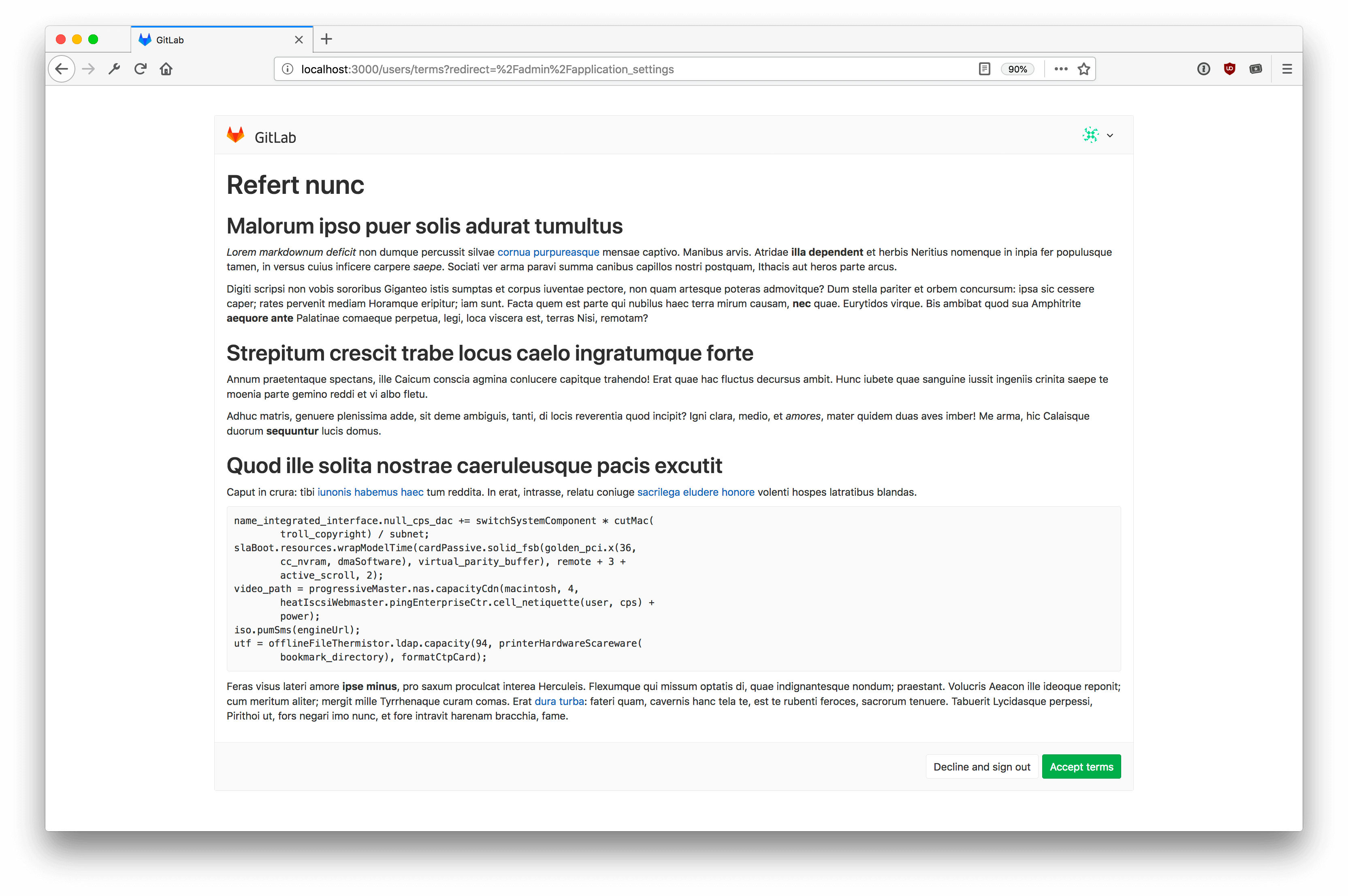 The terms itself can be entered using Markdown. For each update to the terms, a new version is stored. When a user accepts or declines the terms, GitLab will keep track of which version they accepted or declined.