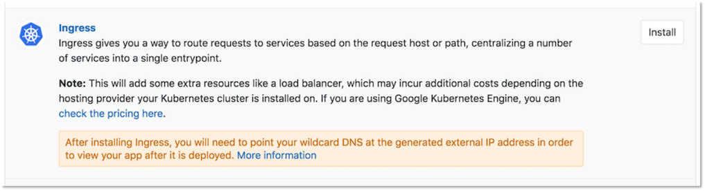 Once Tiller has been installed successfully, click the Install button next to the Ingress app.