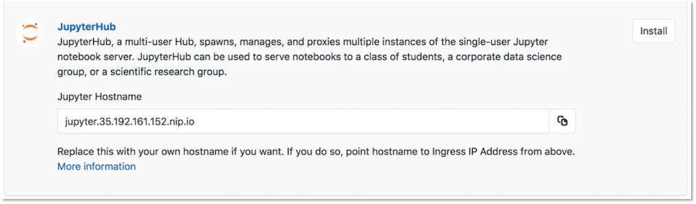 Once Ingress has been installed successfully, click the Install button next to the JupyterHub app.