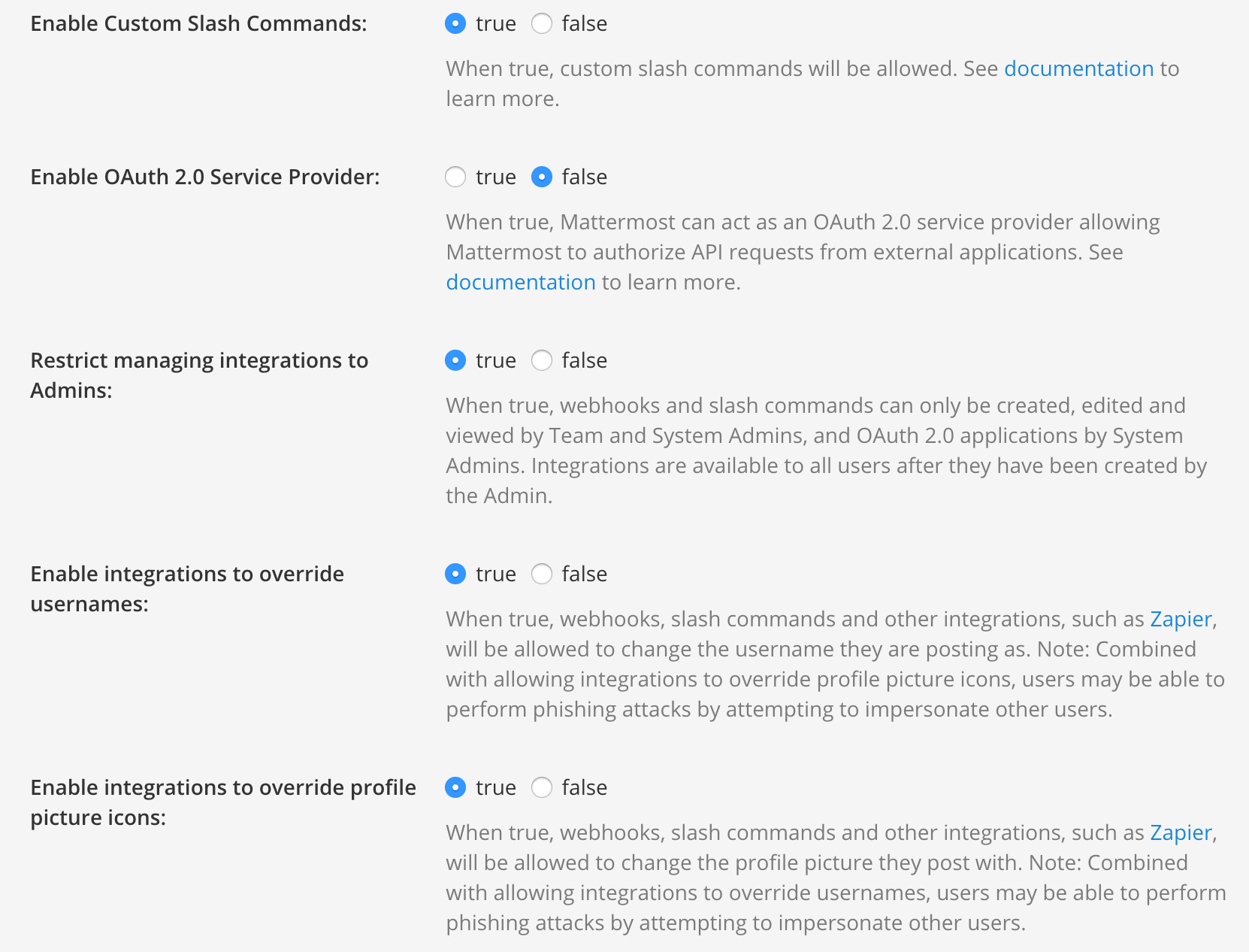 Click Custom integrations and set Enable Custom Slash Commands, Enable custom integrations to override usernames, and Override custom integrations to override profile picture icons to true