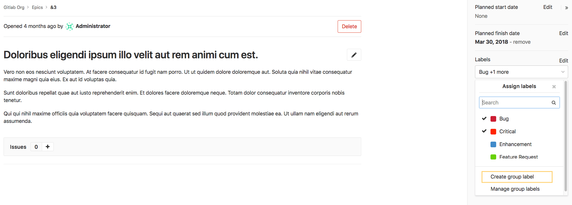 To create a group label, follow similar steps from above to project labels. Navigate to Issues > Labels in the group and create it from there. This page only shows group labels in this group. Alternatively, you can create group labels also from Epic sidebar. Please note that the created label will belong to the immediate group to which epic belongs.