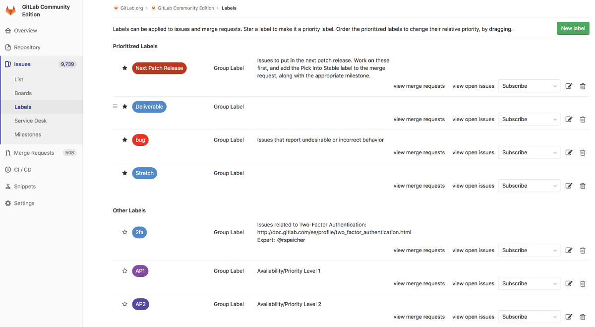 From the project label list page, star a label to indicate that it has a priority. Drag starred labels up and down to change their priority. Higher means higher priority. Prioritization happens at the project level, only on the project label list page, and not on the group label list page. However, both project and group labels can be prioritized on the project label list page since both types are displayed on the project label list page.