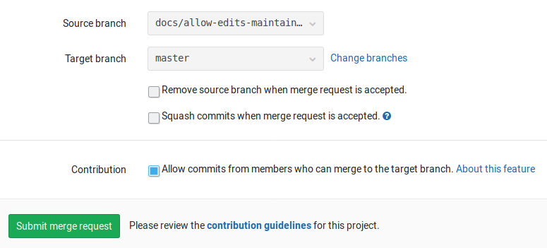 When enabled for a merge request, members with merge access to the target branch of the project will be granted write permissions to the source branch of the merge request.