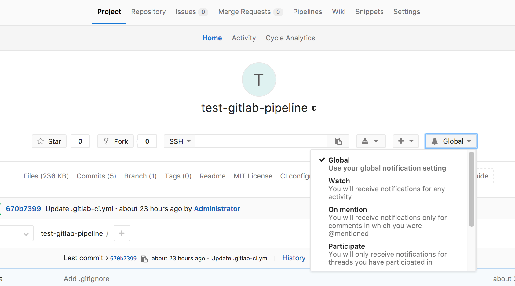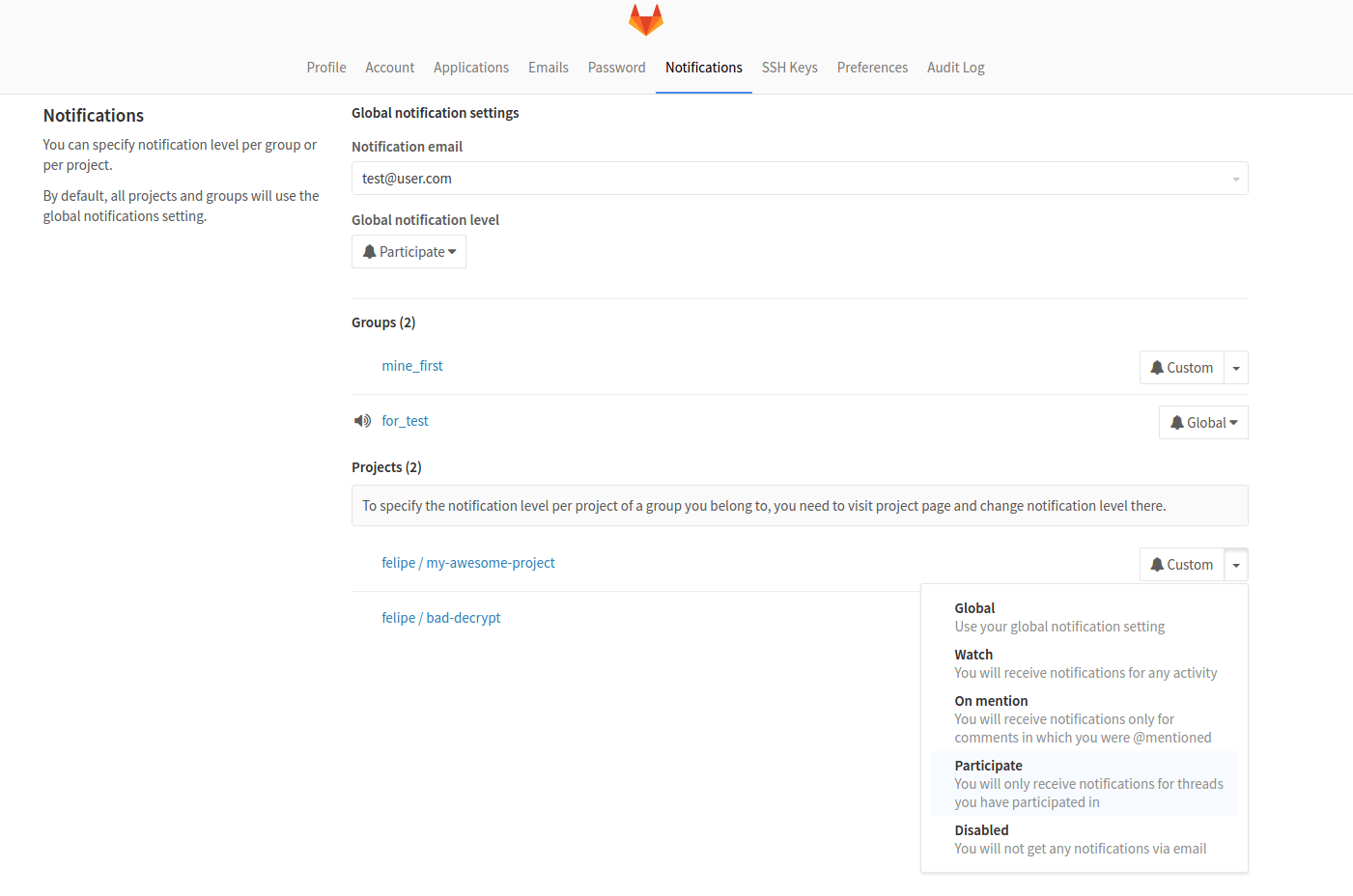This means that you can set a different level of notifications per group while still being able to have a finer level setting per project or subgroup. Organization like this is suitable for users that belong to different groups but don't have the same need for being notified for every group they are member of. These settings can be configured on group page under the name of the group. It will be the dropdown with the bell icon. They can also be configured on the user profile notifications dropdown.